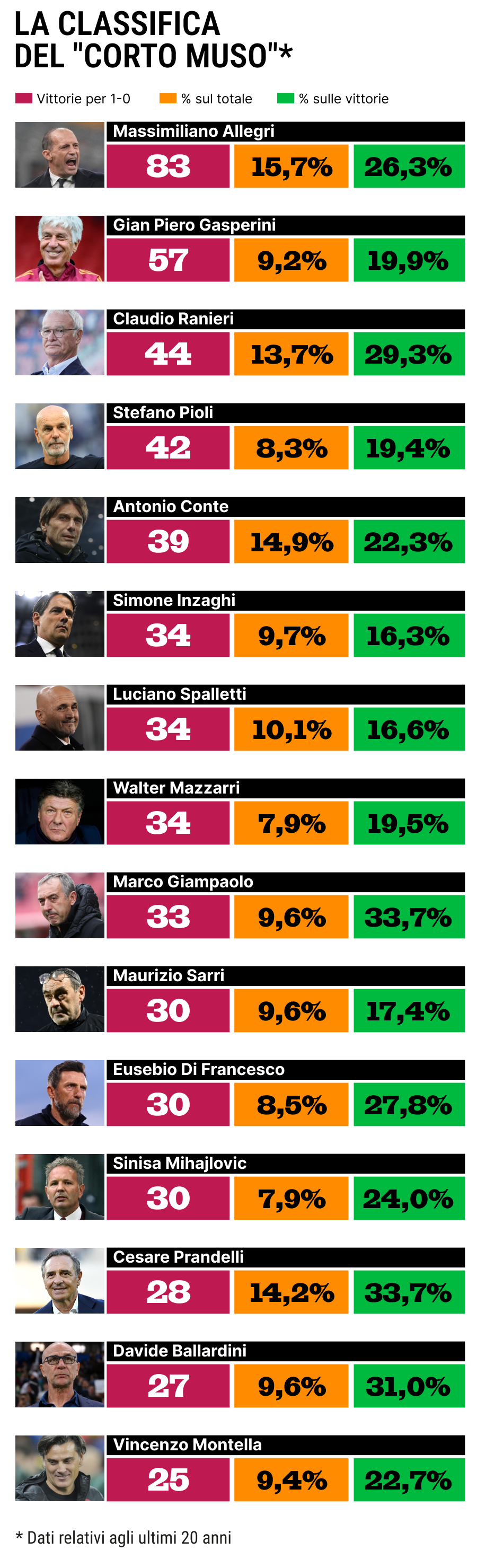 W tym momencie warto sprawdzić, kto jest tuż za nim. W takim kontekście liczby rzadko kłamią. Epokowych niespodzianek brak. Srebro dla Conte (14,9% "1-0" w stosunku do rozegranych meczów), brąz dla Prandelliego (14,2%). Na czwartej pozycji Ancelotti (13,8%) – chyba nikt nit spodziewał się go aż tak wysoko – piąty Ranieri (13,7%), potem Mourinho (13,4%), Corini (13,2%), Mancini i Tudor (12,8%), a Palladino (11,9%) na dziesiątym miejscu. Top 10 ostatnich 20 lat wygląda właśnie tak, podczas gdy na końcu rankingu są: Nicola (5,3%), D’Aversa (5,4%), De Zerbi (6,5%), Ventura (6,9%) i Di Carlo (7%). Sytuacja zmienia się, jeśli weźmiemy pod uwagę udział zwycięstw 1-0 w stosunku do wszystkich wygranych. Tutaj króluje Corini (46,2%), potem Gotti (41,9%), Zanetti (40,7%), Baroni (35,6%) i Prandelli (33,7%). Allegri w tym przypadku jest dopiero 18. z wynikiem 26,3%. Dla Maxa jednak corto muso nie oznacza tylko jednego wyniku: oprócz sześciu zwycięstw 1-0 w tym sezonie wygrał jeszcze trzy razy różnicą jednej bramki.