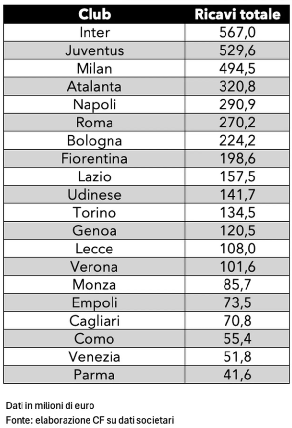 Drużyną, która zanotowała najwyższe przychody w sezonie 24//25 jest Inter (567 mln euro). Nerazzurri swój dobry wynik zawdzięczają przede wszystkim 264 mln euro uzyskanym z praw telewizyjnych. Jest to oczywiście efekt awansu Interu do finału Ligi Mistrzów, a także udziału w Klubowych Mistrzostwach Świata. Drugie miejsce zajął Juventus (529,6 mln), który tym razem wyprzedził Milan. Bianconerim pomógł powrót do Ligi Mistrzów, ale do prześcignięcia Milanu przyczynił się również udział w Klubowych Mistrzostwach Świata. Juventus zanotował także ponad 100 mln euro zysków kapitałowych (plusvalenze).